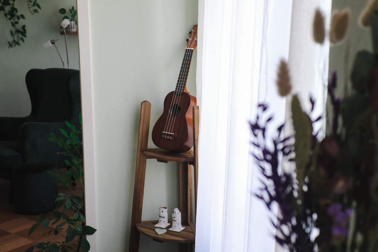 Der Einrichtungsstil ist funktional und persönlich. Jedes der Zimmer hat einen anderen Boden, was Nadia und Jonas als Teil der Geschichte ihrer Wohnung bewusst beibehalten haben. Die Stube ist in einem frischen Mintton gestrichen, dazu kommt viel Holz und immer wieder Farbe. Manche Möbel wirken industrial, anderes hat sich über die Zeit «dazu gefunden» und passt genau deshalb.